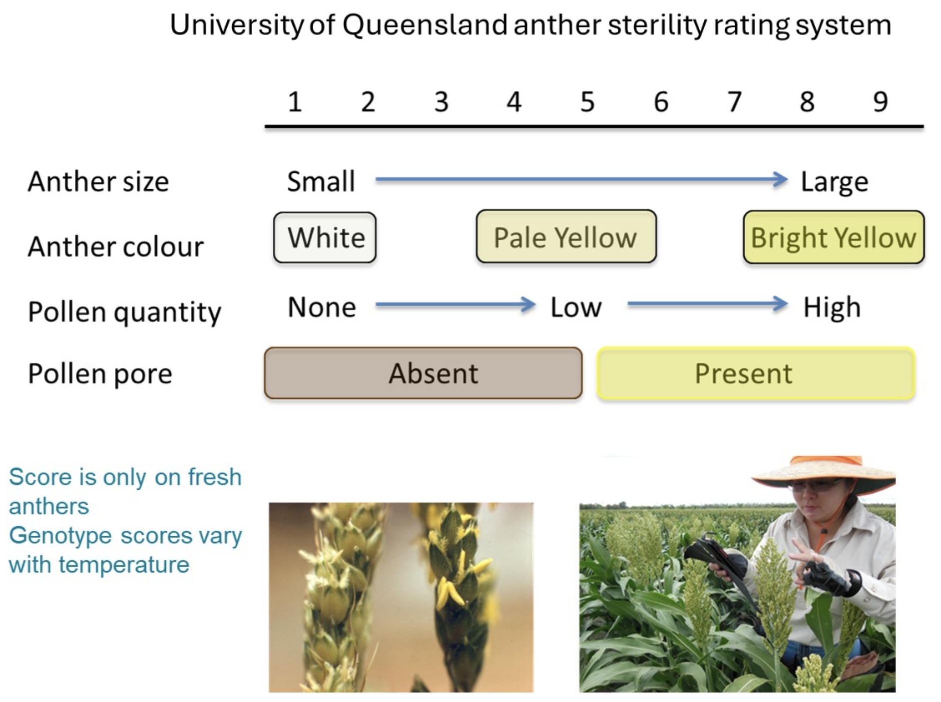 Cytoplasmic male sterility (CMS) systems are widely used in sorghum hybrid breeding, where sterility arises from mitochondrial gene products that disrupt normal pollen development and fertility restoration is typically governed by a small number of major nuclear restorer genes. However, sorghum breeders face a persistent challenge with partial fertility, a phenomenon in which CMS lines produce some viable pollen, particularly under high temperatures at flowering. Unlike fertility restoration, which is controlled by major Rf genes, partial fertility is largely governed by minor-effect loci with complex environmental interactions. This trait is problematic for commercial seed production because self-pollination in female parent lines compromises hybrid purity and renders seed unsaleable. Identifying and excluding partial fertility genes is challenging since the phenotype only becomes evident when sterile cytoplasm is introgressed into new female lines, and expression varies with environmental conditions. Consequently, substantial breeding effort is required to ensure the stability of sterility in CMS-based hybrid systems.