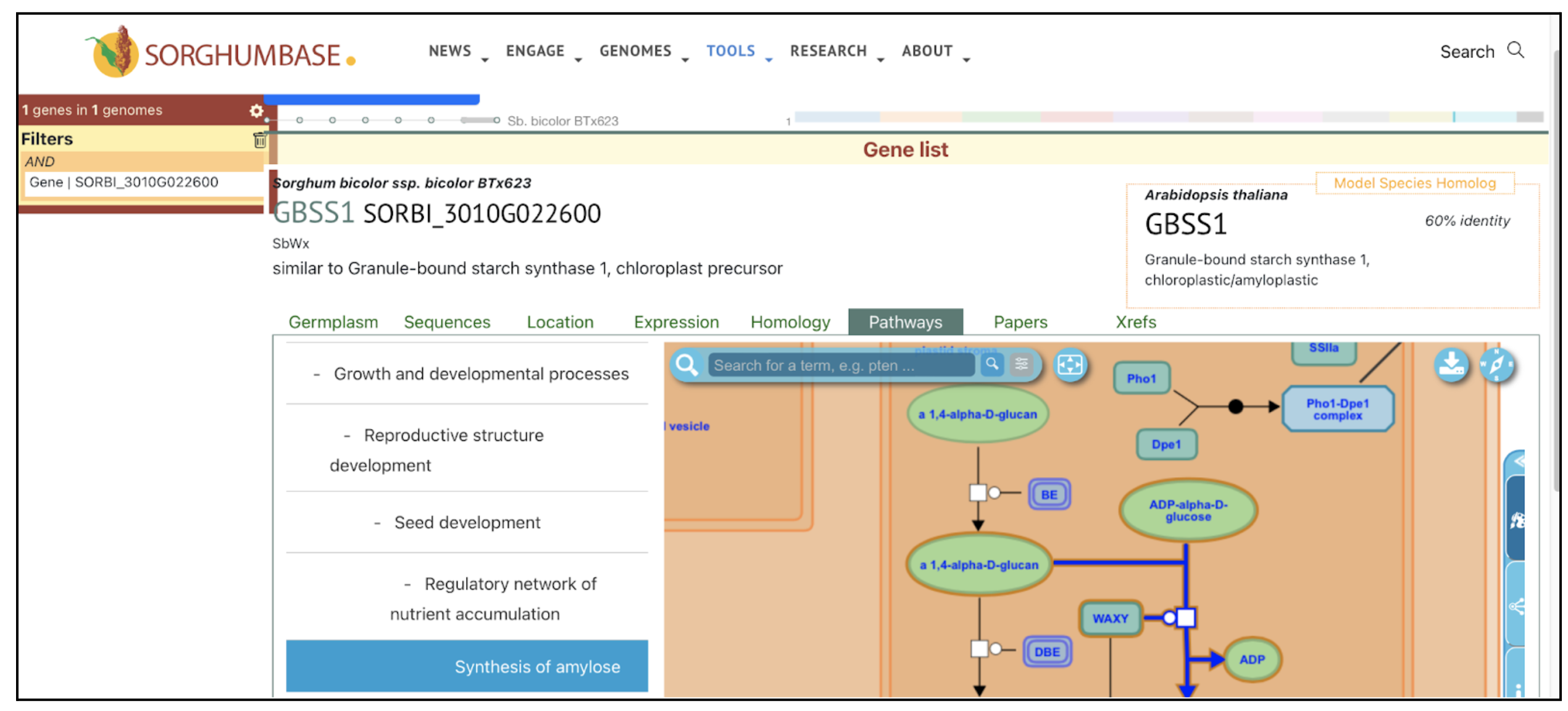 Mutations in the sorghum Waxy (GBSS) gene reduce amylose content and create value-added grain traits, and new genomic resources now enable more efficient breeding of waxy sorghum for food, feed, and biofuel applications.