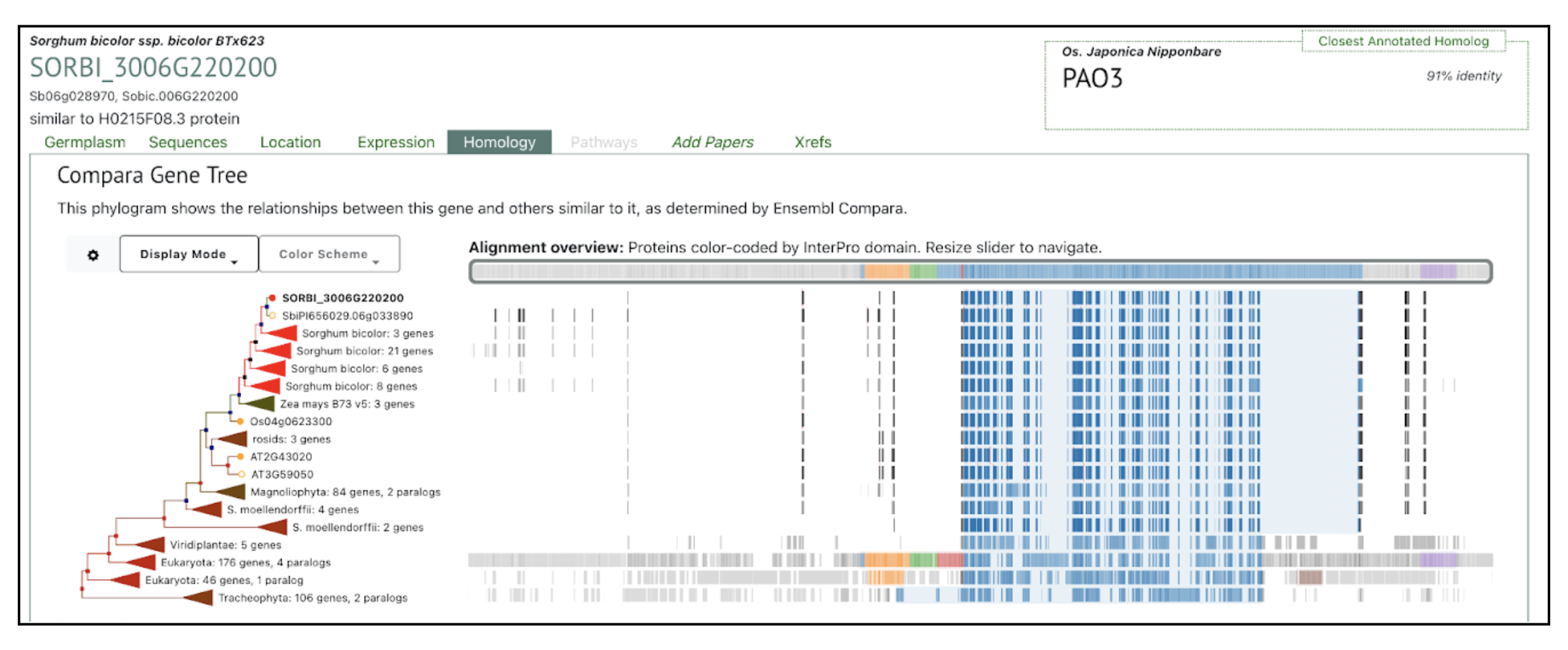 The SorghumBase Homology panel positions SbPAO5 within a conserved monocot clade of polyamine oxidase genes, alongside multiple Sorghum bicolor paralogs and close orthologs from maize and rice. The closest annotated homolog, rice PAO3 (91% identity) further underscores deep conservation across cereals. The alignment overview to the right shows that SbPAO5 contains the IPR002937 Amino_oxidase (Amine oxidase) domain, a catalytic domain shared by 457 of 472 genes (96.8%) in this gene tree. This high degree of domain conservation matches the study’s comparative genomics findings, which indicate that the PAO gene family underwent segmental duplication while retaining the core amine-oxidase catalytic machinery essential for polyamine turnover and drought-responsive signaling.