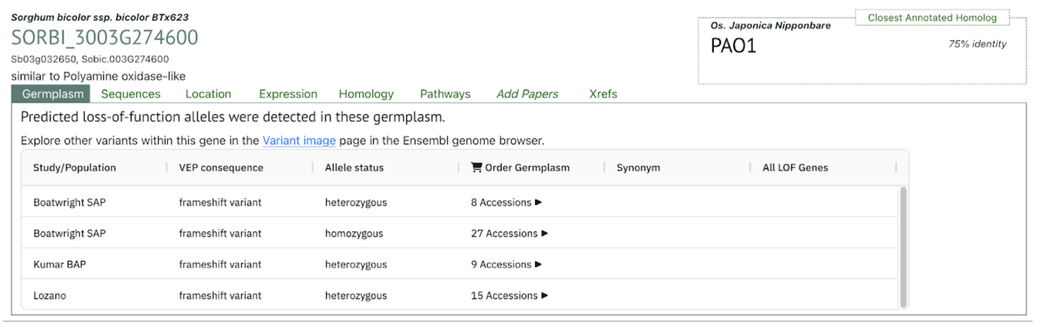 The SorghumBase Germplasm view shows that SbPAO6 carries frameshift loss-of-function (LOF) variants in several diversity panels, including the Boatwright SAP, Kumar BAP, and the Lozano collection. These variants occur in both heterozygous and homozygous states, with up to 27 accessions carrying homozygous frameshift alleles in the Boatwright SAP panel. This indicates that natural LOF variants of SbPAO6 are present and moderately frequent within global sorghum diversity, providing valuable genetic resources for testing the functional contribution of SbPAO6 to drought tolerance and polyamine-oxidase–mediated stress responses.