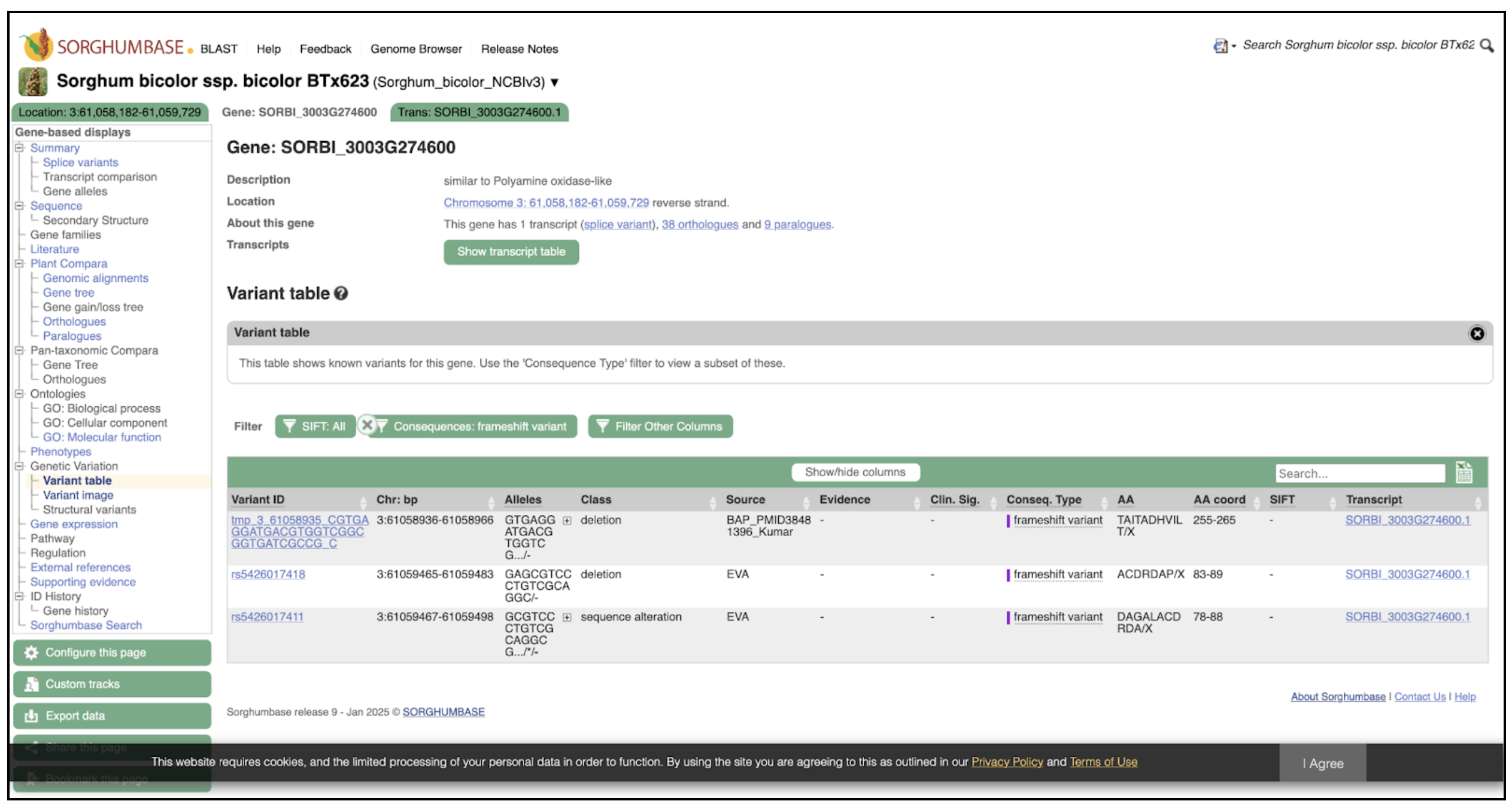The Variant Table lists three independent frameshift variants in SbPAO6, each classified as a deletion or sequence alteration predicted to disrupt the protein-coding sequence. These variants originate from curated population studies, including the Kumar BAP panel and EVA submissions. Amino acid consequence annotations indicate that frameshifts occur at positions 78–89 and 255–265, likely abolishing or severely reducing PAO catalytic activity. Together with the germplasm-level summaries shown in Figure 2A, these entries demonstrate the presence of naturally occurring functional knockouts of SbPAO6, offering strong candidates for genotype–phenotype association studies and targeted functional validation.