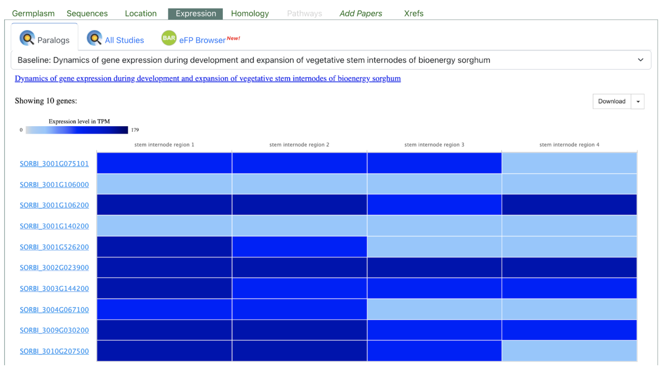 The SorghumBase Expression Atlas shows both genes within a paralog cluster associated with sorghum stem development. Although SbTALE03 and SbTALE04 share a common TALE-domain ancestry, their expression patterns differ markedly across the four stem internode regions shown. SbTALE03 displays moderate but consistent expression throughout the internode gradient, whereas SbTALE04 exhibits stronger and more dynamic expression, particularly in the more mature internode regions. This divergence suggests subfunctionalization of the two paralogs, consistent with the study’s findings that each gene regulates distinct components of the stem developmental gene regulatory network. These contrasting expression profiles highlight how SorghumBase can reveal functional differentiation among paralogs in sorghum developmental biology