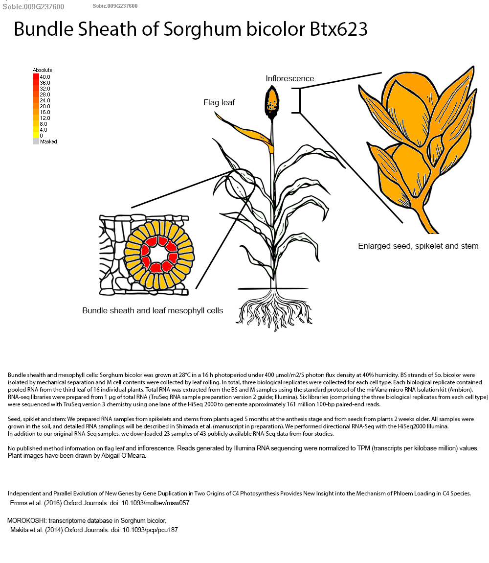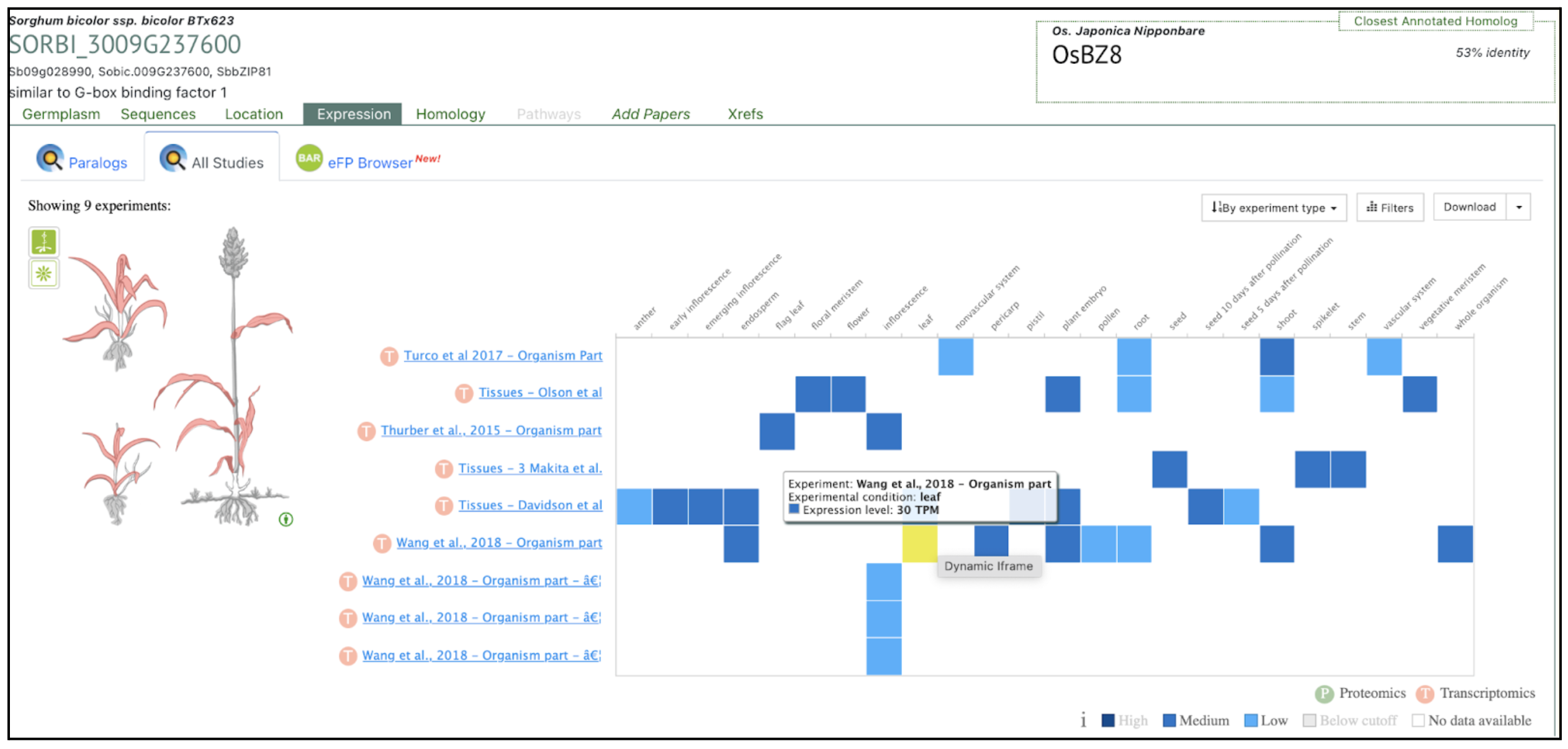 Figure1A,B: Expression profile of SORBI_3009G237600 (SbbZIP81) on SorghumBase. The SorghumBase Expression tab displays transcript abundance for SbbZIP81 across over 20 multiple tissues and developmental stages in BTx623. SbbZIP81 ​​across multiple tissues and developmental stages from published transcriptome datasets. Heatmap shading indicates TPM expression levels (blue = higher expression; white = below cutoff). The accompanying BAR eFP Browser visualization further localizes SbbZIP81 Expression levels across tissues are shown using an absolute scale (0–40). Anatomical illustrations highlight bundle sheath and mesophyll cells, the flag leaf, inflorescence, and enlarged spikelet/seed structures.