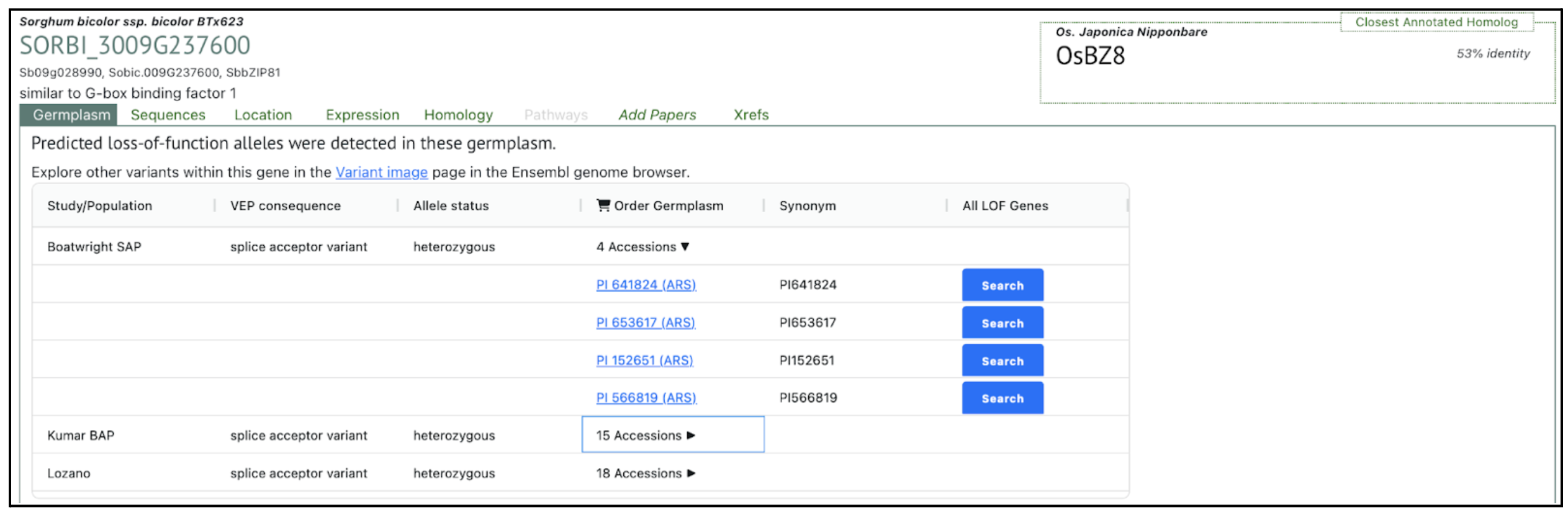 Figure 2: Germplasm tab indicated several splice acceptor loss-of-function alleles for SbbZIP81 (SORBI_3009G237600) across sorghum diversity panels, indicating natural genetic variation with potential impacts on gene function. Heterozygous/Homozygous variants were observed across multiple accessions within the Boatwright SAP, Kumar BAP, and Lozano panels.