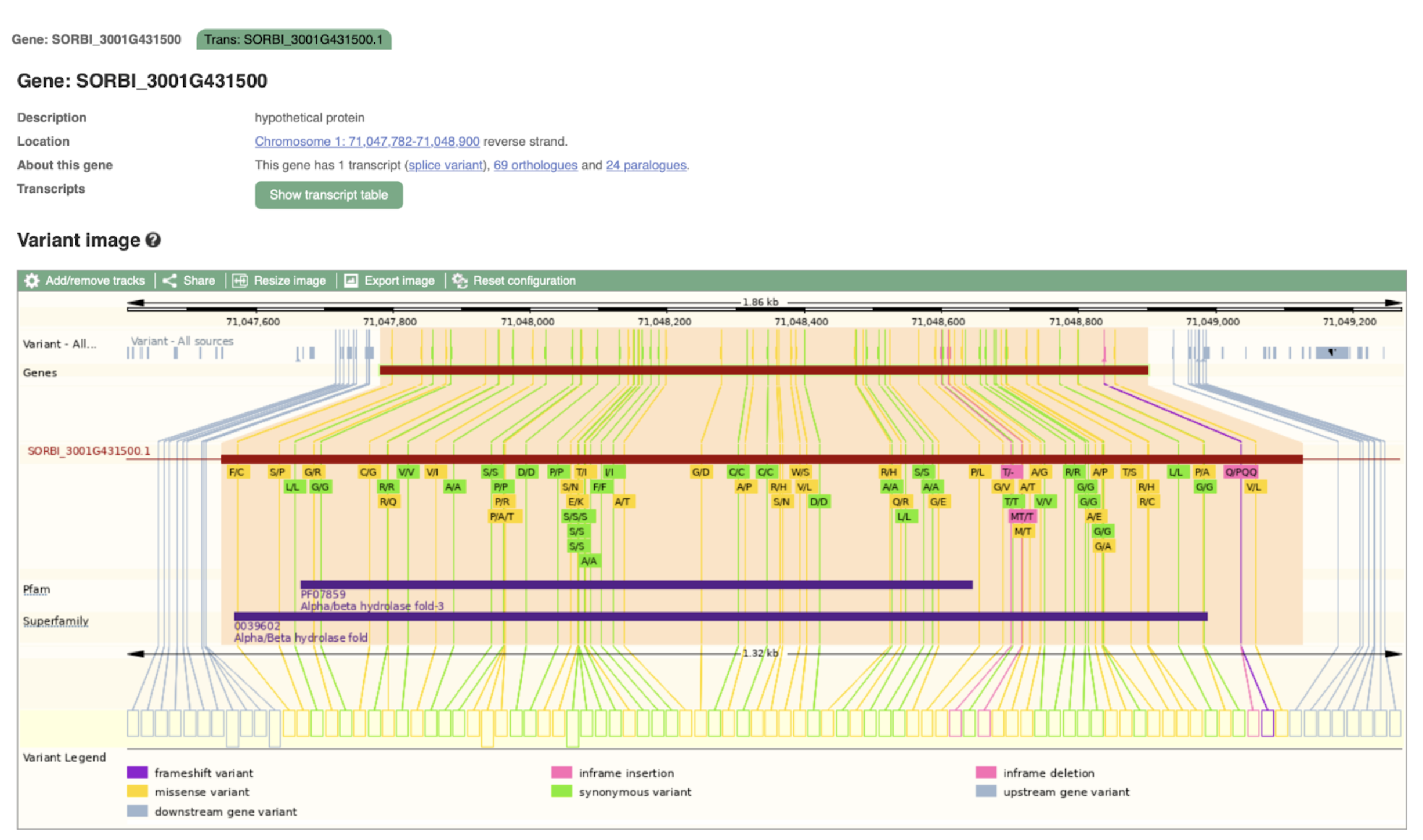 Figure 1: The Ensembl Variant tab in SorghumBase displays the variant image table. The sorghum gene SORBI_3001G431500, annotated as a hypothetical protein, shares homology with GID1B (AT3G63010) in Arabidopsis, a gene known to play an important role in abiotic stress responses, particularly salt stress. In researchers’ work, GID1B was examined as one of 29 candidate genes. For the sorghum gene SORBI_3001G431500, two SNPs were identified within the exon region (positions 71,047,857 and 71,048,187), both of which are synonymous. The image above shows a snapshot of the variant landscape for this gene.